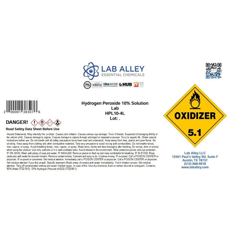 - Hydrogen Peroxide 10% Lab Grade: Every day, people and commercial facilities use this valuable and helpful compound.