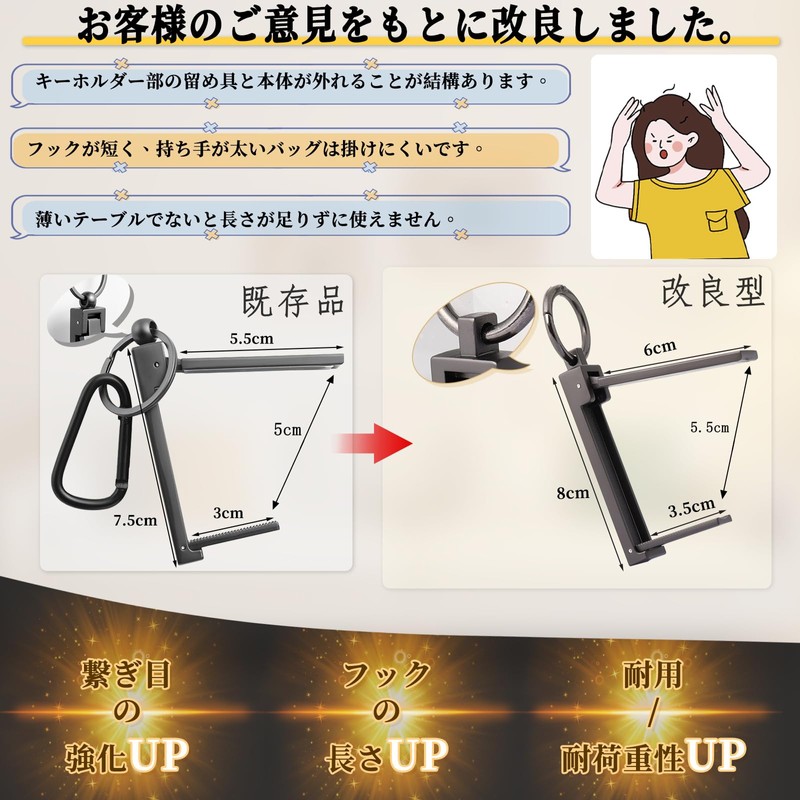 - Introducing an improved bag hook According to the reviews, we gathered feedback that the connection is fragile, the hook is too short to hang a bag, and the length is too short to be used on a thick table. We listen to our customers seriously and reinforce the connections, extend the overall length and hook length, according to the customer's feedback, we have solved all problems