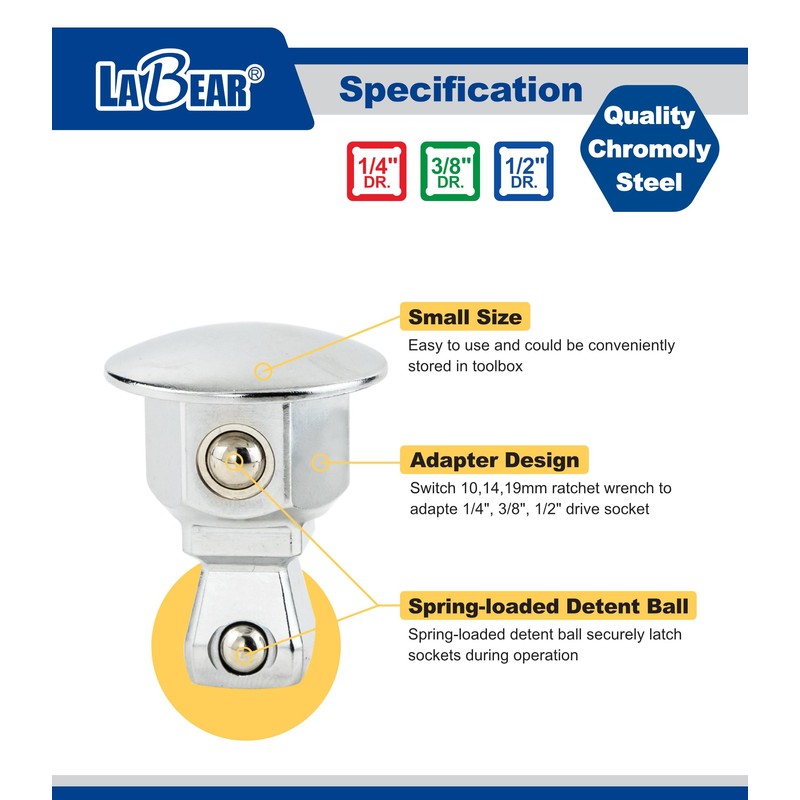 - [Ball Detent Locking System] Each adapter features a spring-loaded detent ball for secure socket retention and quick change-outs.