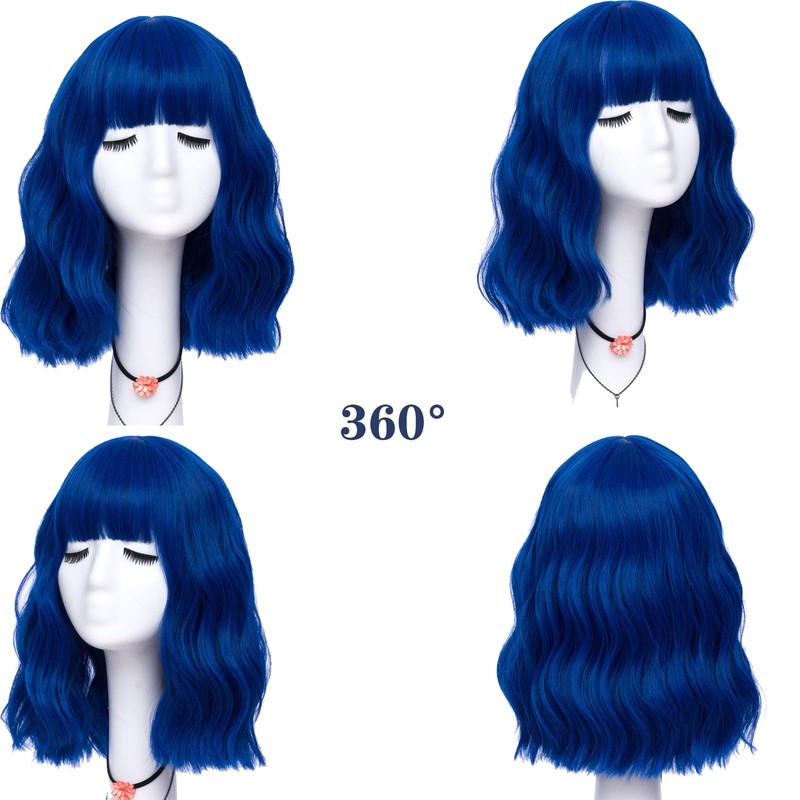 LABEAUTÉ Blue Wig Short Bob Wavy Wig with Air Bangs for Women, Heat Resistance Shoulder Length Curled Wigs for Daily Use, Cosplay and Theme Parties- 14inch, Royal Blue