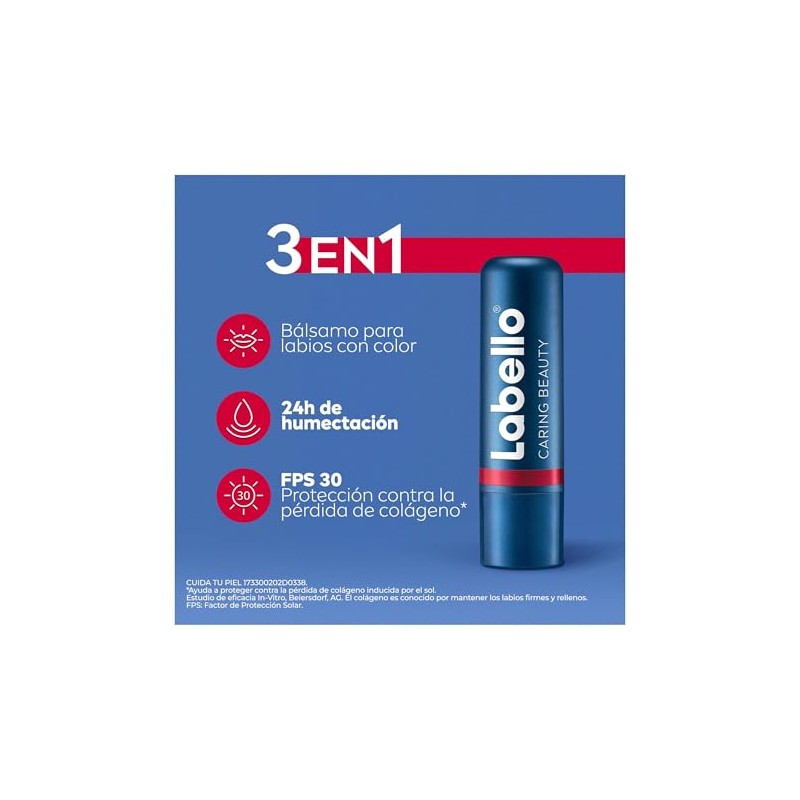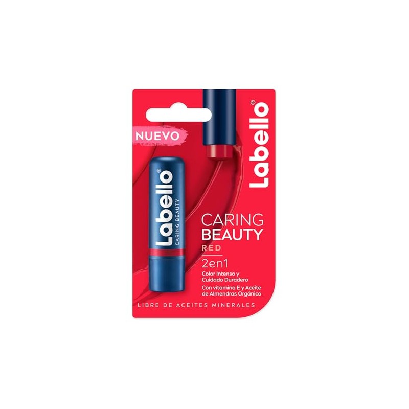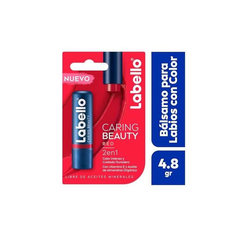 CONSEGUIR COLOR Y CUIDADO, NUNCA FUE TAN FÁCIL NUEVO Bálsamo labial LABELLO Caring Beauty 2 en 1: combina color intenso con el confiable cuidado de Labello. su fórmula enriquecida con manteca de karité, aceite de almendras orgánico, vitamina E, se desarrolló especialmente para cuidar y humectar tus labios de manera prolongada. Obtén un hermoso acabado brillante de color sin resecar tus labios. Intensifica el color aplicando varias capas y retoca fácilmente en cualquier momento y en cualquier lugar. Para unos labios suaves e irresistibles todos los días El bálsamo labial Labello Caring Beauty está disponible en 4 tonos: Rojo, Rosa, Violeta, Nude. Un tono diferente para cada estilo y ocasión.Aplica sobre los labios de manera uniforme, intensifica el color aplicando varias capas y retoca fácilmente en cualquier momento y en cualquier lugar. De uso diario. Compatibilidad con la piel dermatológicamente probada. Beneficios:Combina pigmentos de color intensos con el confiable cuidado de Labello. Acabado brillante de color sin resecar tus labios. Se desliza de manera fácil y uniforme. Fórmula con manteca de karité, aceite de almendras orgánico y Vitamina E. Ligero aroma floral.