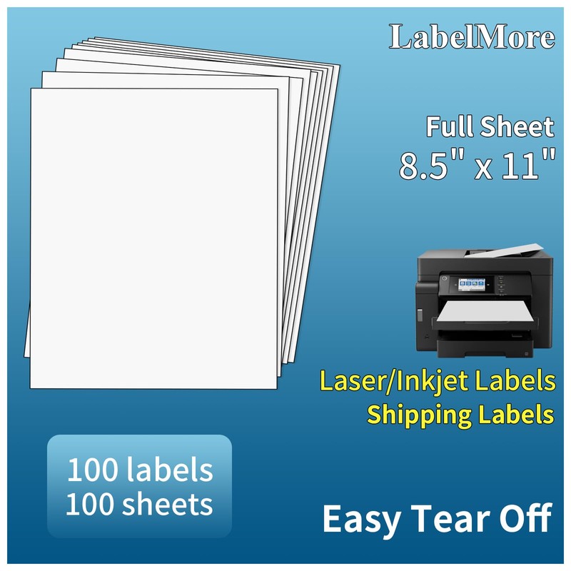 LabelMore 100 Sheets, Printable Sticker Paper, 8.5" x 11" Sticker Printer Paper Sheet for Laser & Inkjet Printers