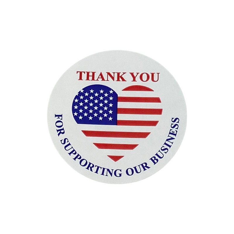 The "Thank You Supporting Small Business 2" Flag Heart Adhesive Labels" are self-stick adhesive labels designed for easy application. Each roll contains 500 labels, with a total of 1000 labels across 2 rolls. These 2-inch circle labels feature a "Thank You" message and are ideal for retail use. Made in the United States, these labels are perfect for showing appreciation to customers and supporting small businesses.
