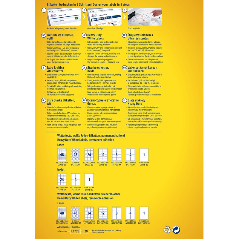 **Highlights:** **·** Ideal, for instance, for product labelling in the open **·** Resistant to oil, dust and temperature from -20 to +80° C **·** Splash- and tear-proof **·** For laser, colour laser printer, copier **Technical Specifications:** ATT.PRINTABLE_BY: Laser, Laser, colour, Copier **·** Can be printed on: Yes **·** Colour: White **·** Content: 480 Units **·** Format: DIN A4 **·** Glue behavior: Permanent adhesive **·** Label format: rectangular, rounded corners **·** Label height: 33.9 mm **·** Label size: 63,5 x 33,9 mm **·** Label use: Mark, Point, Send **·** Label width: 63.5 mm **·** Package contents: 20 sheet **·** Suitable for: Laser & colour laser printers, photocopiers **Description:** Especially sturdy labels for identifying objects and products or for making warning signs. Easy printing with the free download software Avery Zweckform Wizard Software for Microsoft Off