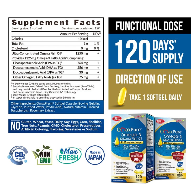 LABO Nutrition OmaxPure Omega3 Fish Oil - 1125mg Omega 3 IFOS Certified - High Potency rTG Omega Fish Oil Supplement with DHA & EPA - 120 Softgels