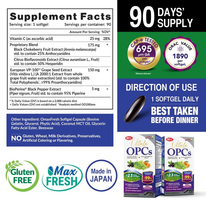 LABO Nutrition LABO Nutrition Vitale OPCs | Premium European Grape Seed Extract with Aronia, Citrus Bioflavonoids | Supports Circulation, Skin Health and Cellular Protection | 100% polyphenols 90 Softgels