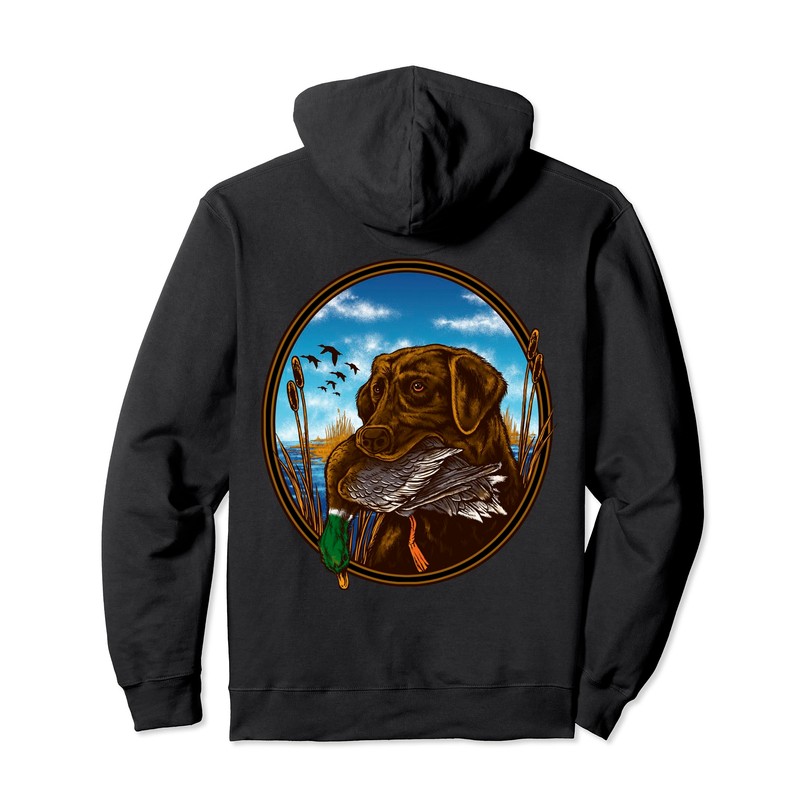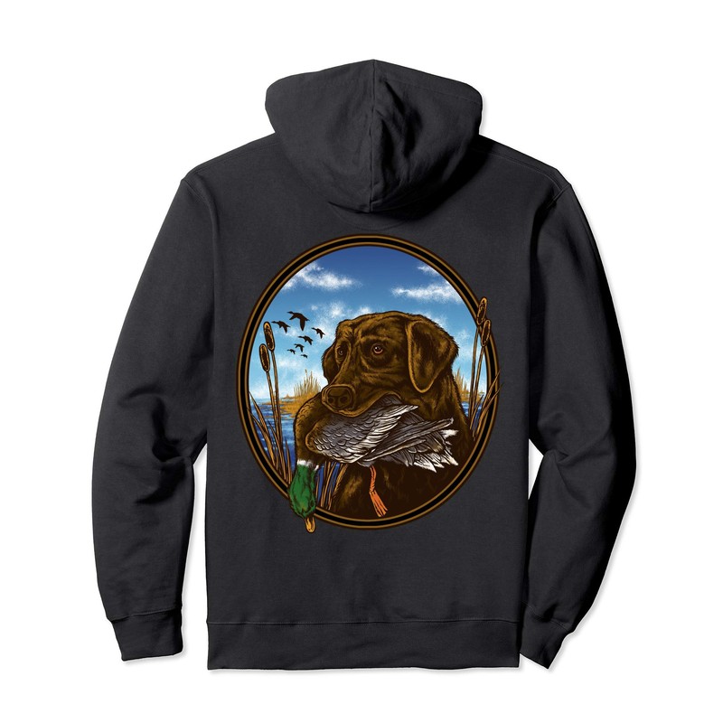• This graphic features a detailed graphic of a chocolate labrador retriever returning a beautiful male mallard back to his owner. This duck hunting gear is the perfect addition to your hunting gear and apparel.