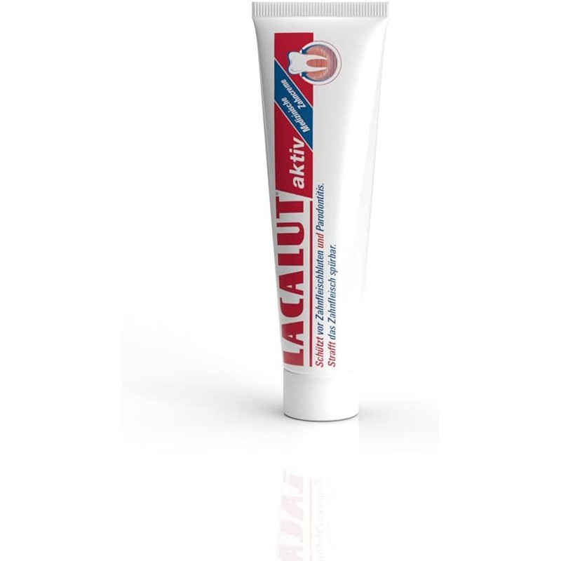 2 x Lacalut Active Toothpaste This medical toothpaste contains a special active ingredient formula: the effect on the gums is immediately noticeable due to its astringent effect. The gums are tightened and firmed. Bacterial dental plaques are eliminated and the formation of new formation. The enamel is hardened by the aluminium fluoride and therefore more resistant to tooth decay. The result: bleeding gums is stopped. The irritation and pain sensitivity of the teeth is reduced. Gum disease is prevented for protection and maintenance is stopped. The irritation and pain sensitivity of the teeth is reduced. Gum disease is prevented to protect and maintain healthy teeth.