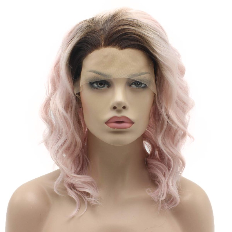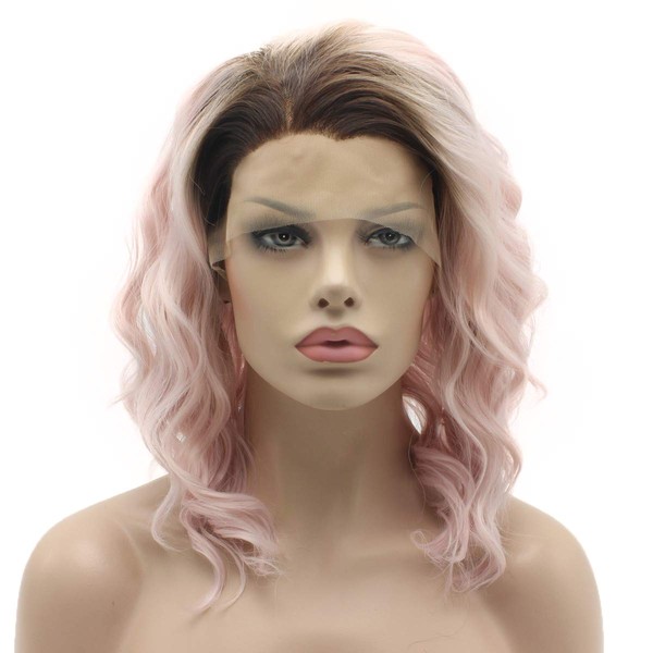 Lace Front Synthetic Wig Medium Length Wavy 14inch Dark Root Pink Ombre Wig Stylish Wig