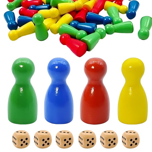 LACHT Toy Figures Set, 96 Colourful Halma Gel Toy Figures Wooden 25 x 12 mm and 6 Wooden Dice with Bag for Storage, Toy Figures for Board Games, Red, Yellow, Blue, Green
