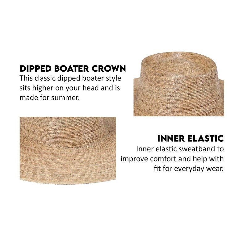 - Featuring a dipped boater crown and an inner elastic sweatband to help with fit, this hat is perfect for the summer soiree of your choice!