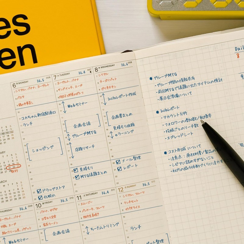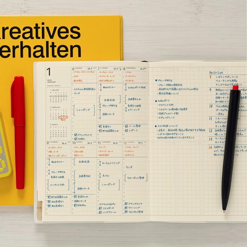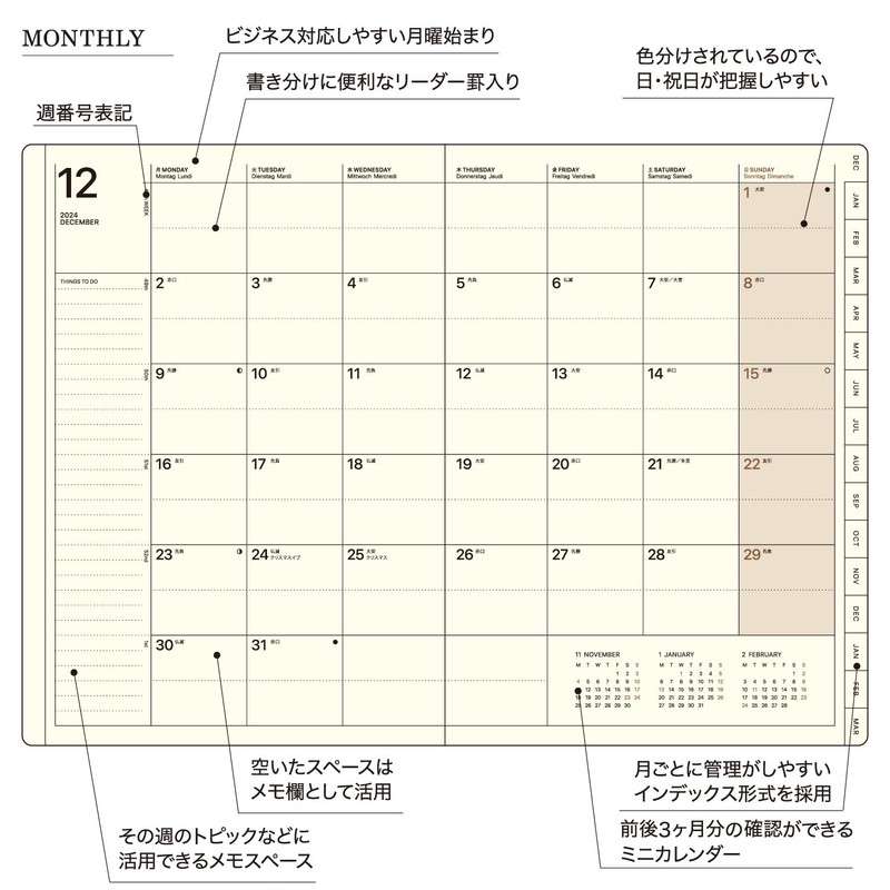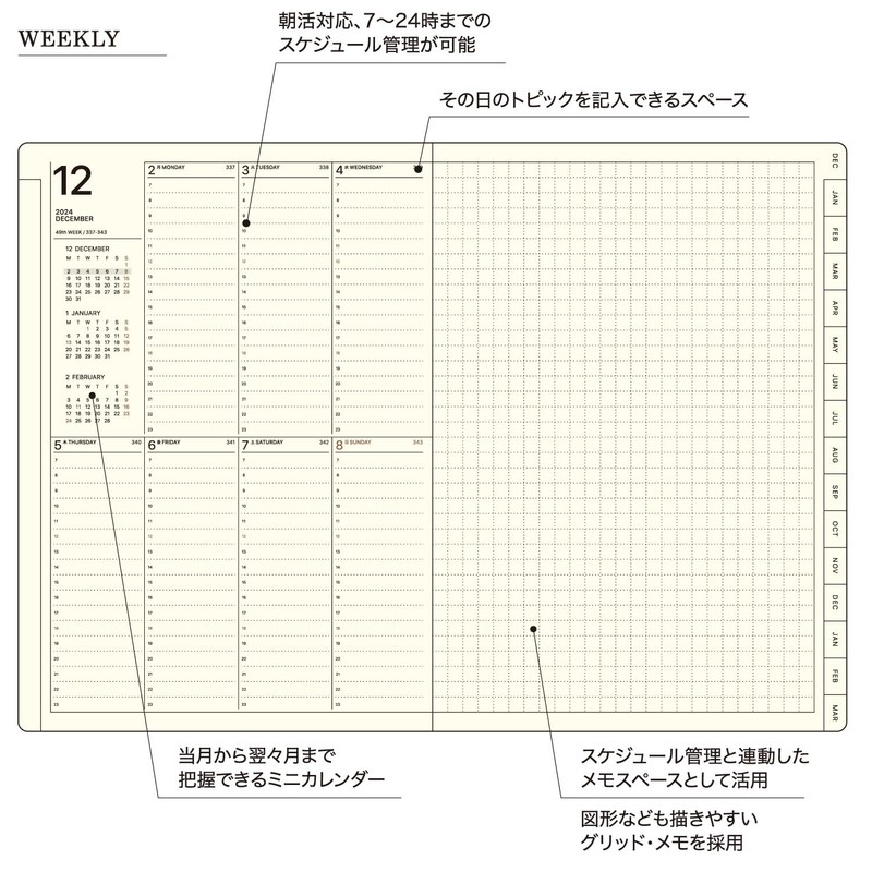 • Vertical Left Type: A revolutionary weekly diary with time management and ample notes column. Vertical 1 week on the left page (starting Monday, equal weekends and weekends), and the right page is a 0.2-inch (5 mm) grid note that allows you to draw shapes as well. The time frame is available from 7:00 to 24:00 for morning activities. The indexed design makes it easy to schedule and keep notes on a monthly basis