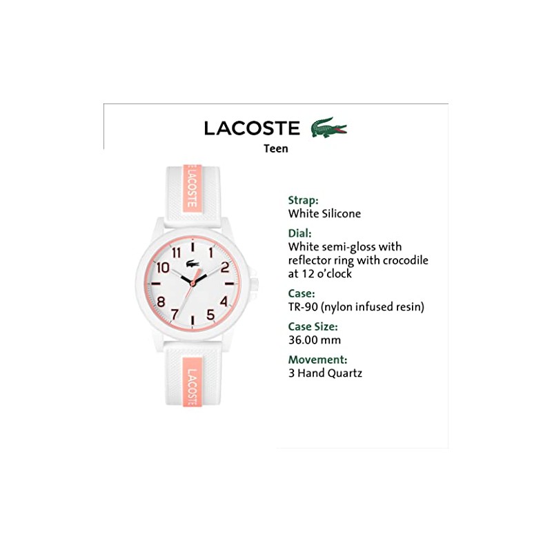 • Lacoste Rider Watch: Offers sporty teen style with a three-hand design,crown protection,and a notched bezel.The comfortable silicone strap adds to its appeal, making it perfect for fashion-conscious pre-teens to enjoy their own taste of the Lacoste look.