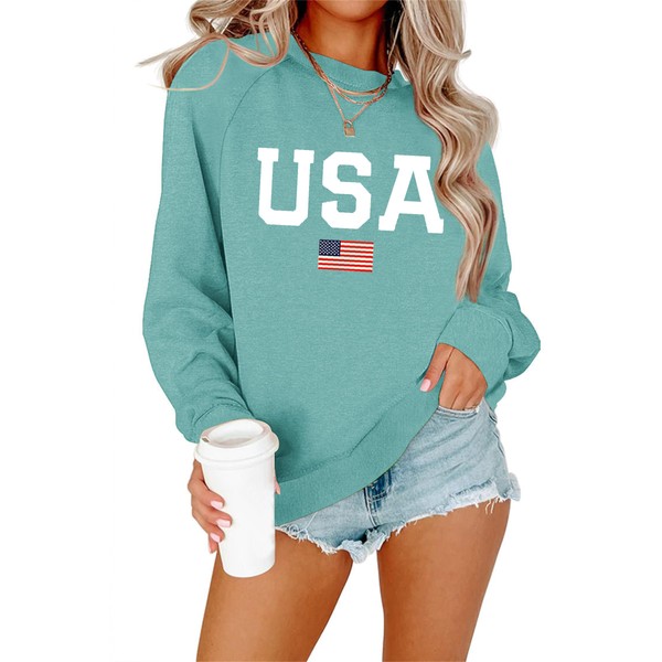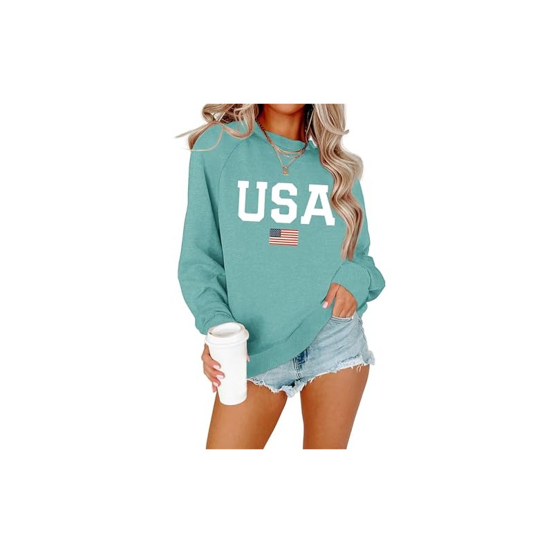 Lacozy Womens USA Sweatshirt Crewneck Long Sleeve Oversized Graph Letter Pullover Loose Winter Clothes Blue Green XXL