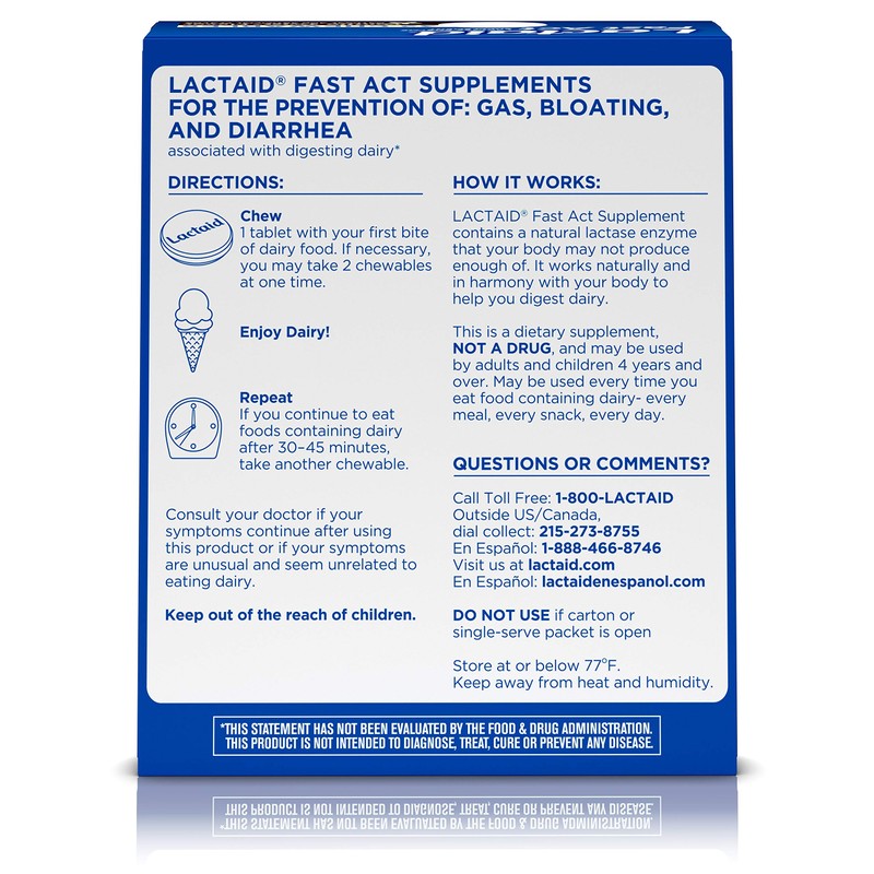 - 32-count single-dose travel packs of Lactaid Fast Act Lactose Intolerance Chewables with Vanilla Twist flavor help prevent gas, bloating and diarrhea associated with lactose intolerance