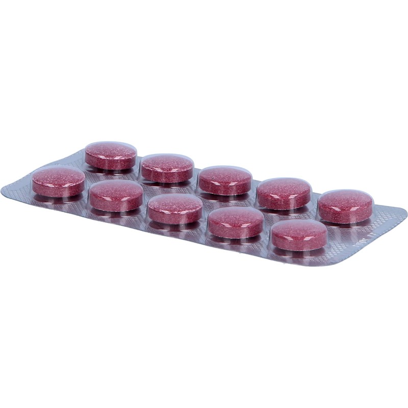 Free from sugar, gluten, gelatin, yeast and lactose. Suitable for vegans. The tablets have a natural red colour and a typical cranberry taste.