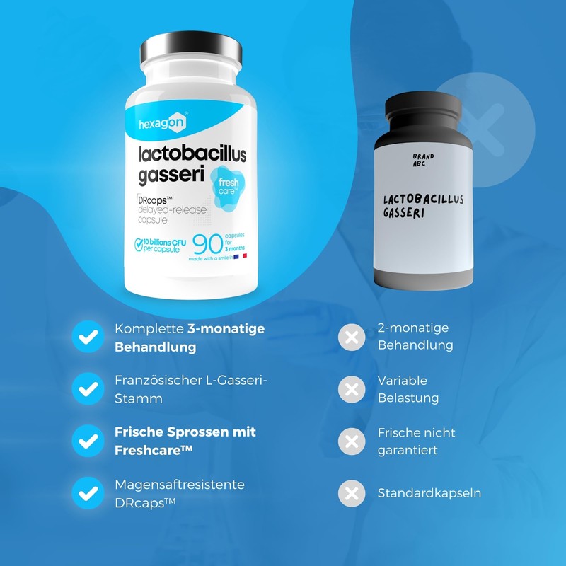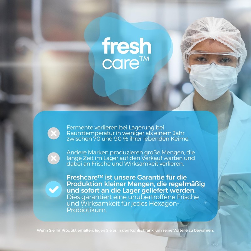 - Fresh care for optimal freshness: Unlike large production batches that lose effectiveness in warehouses, our Freshcare system guarantees maximum freshness and effectiveness by producing small quantities and shipping regularly. This ensures an incomparable freshness of our hexagon probiotics.