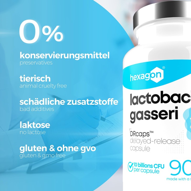 Each capsule contains 10 billion CFUs (colony forming units) of Lactobacillus gasseri, encapsulated in a delayed release HPMC plant capsule (DR) to protect the probiotics from stomach acid and ensure their effectiveness in the intestine.