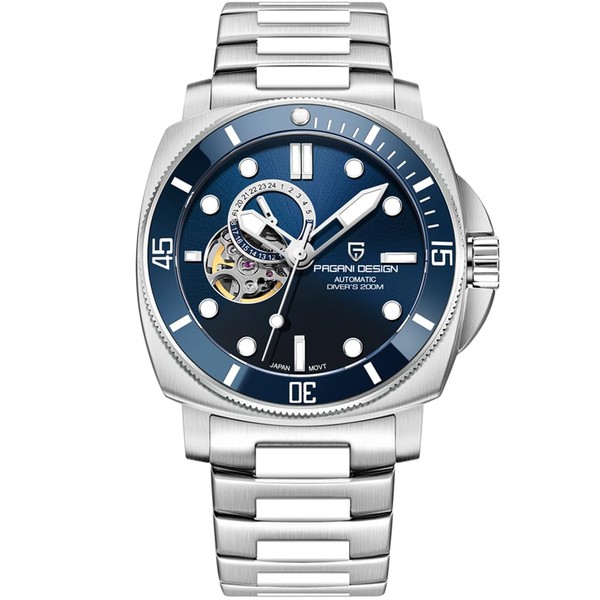 - PAGANI DESIGN men's watch: PD1736 automatic winding mechanical movement, completely developed by PAGANI DESIGN, oversized dial, about 43mm, thickness 13mm, balance wheel, hollow dial