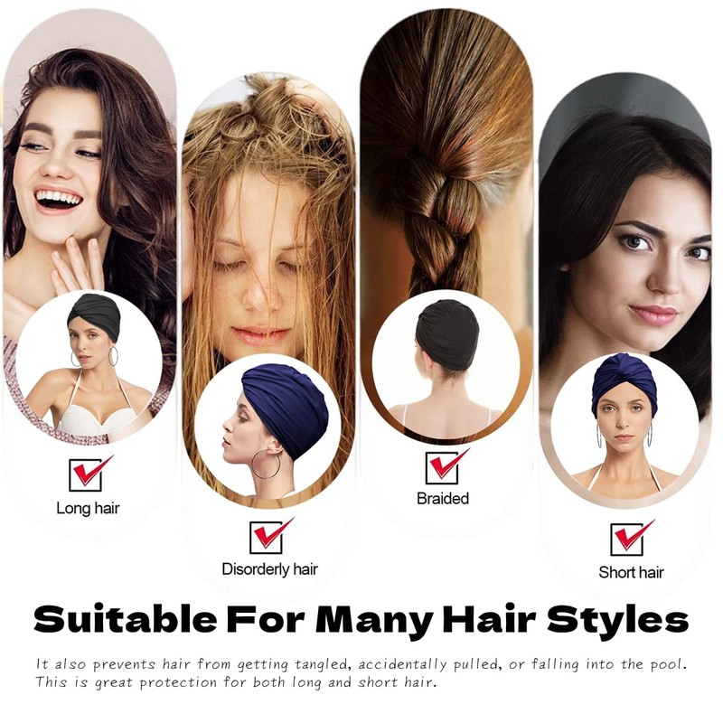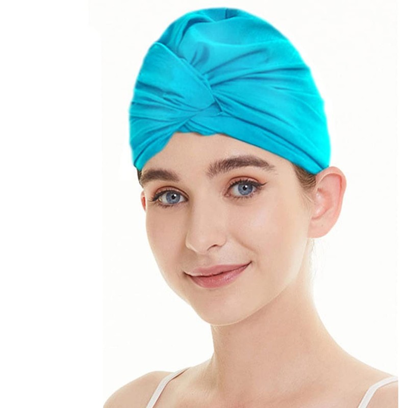 - WIDE RANGE OF APPLICATIONS: Fashionable headband with pleated and twisted design can be used as a chic swimming cap, beautiful sleeping cap or chemotherapy cap. Can be used for swimming, surfing, beach sunbathing, swimming pools, spas, spas, etc. It can also be used for shower and bath, and can be used as a shower cap, sleeping cap, chemo cap. It is a beautiful headwear for women or girls.