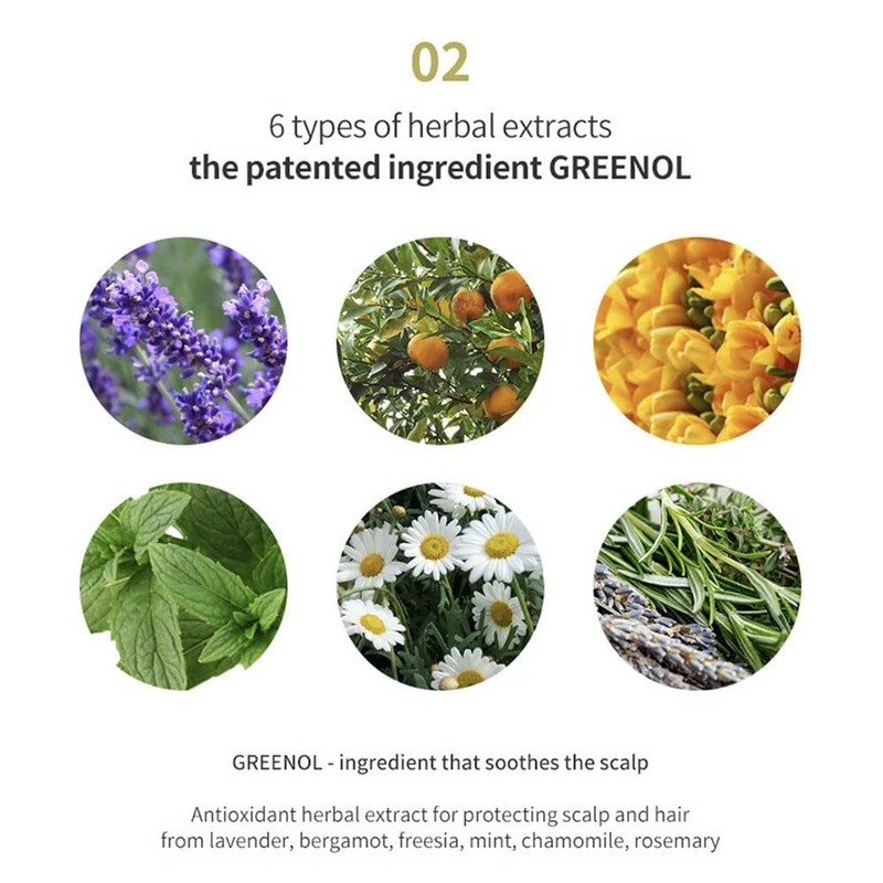 - Contains the natural patented herbal composition Greenall, which protects and restores hair, is an antioxidant and has a soothing effect on the scalp