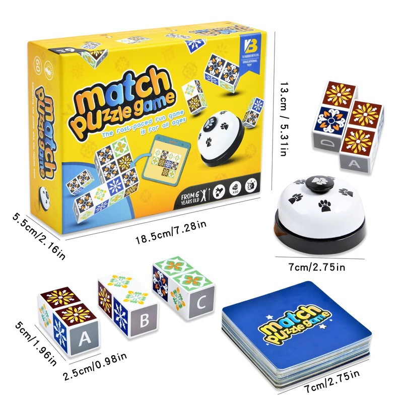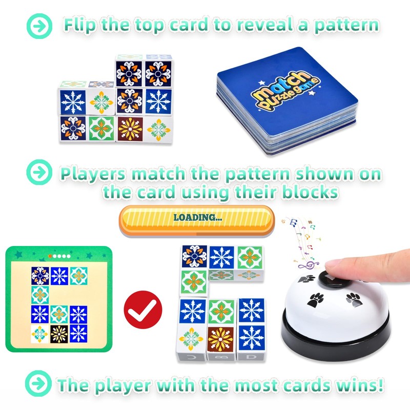 LADVATKIN Wooden Matching Game Puzzle Games, Shape Pattern Block Brain Game 2.0 with Bell for Family Night, Match Puzzles Building Cubes Toy Board Games for Children and Adults