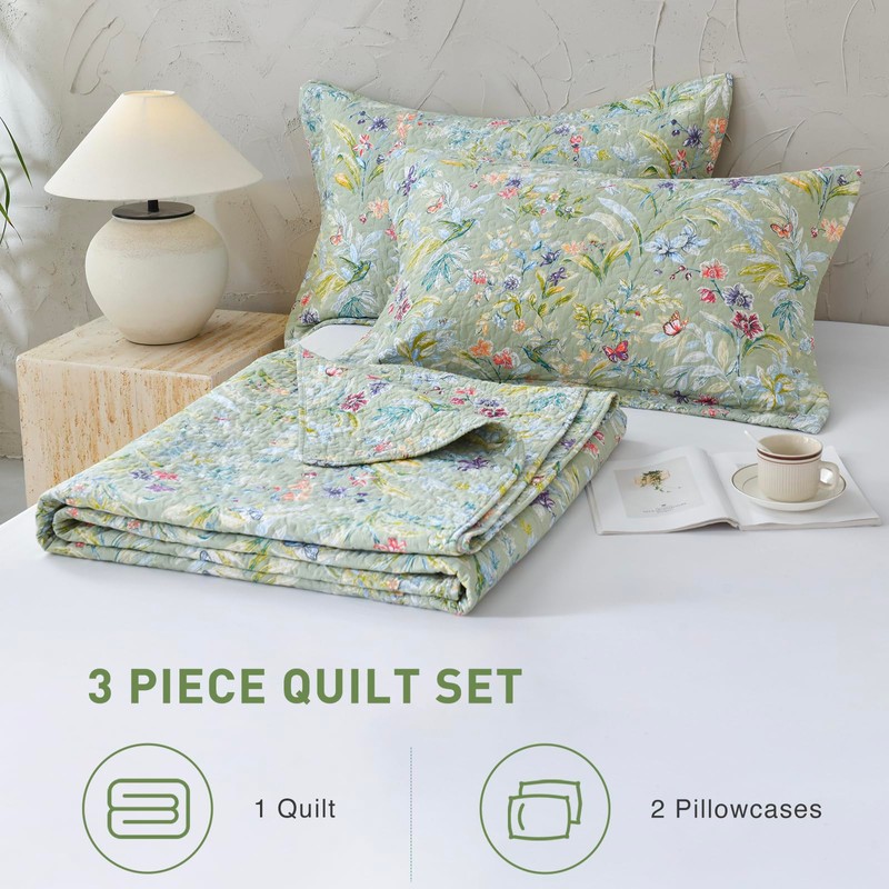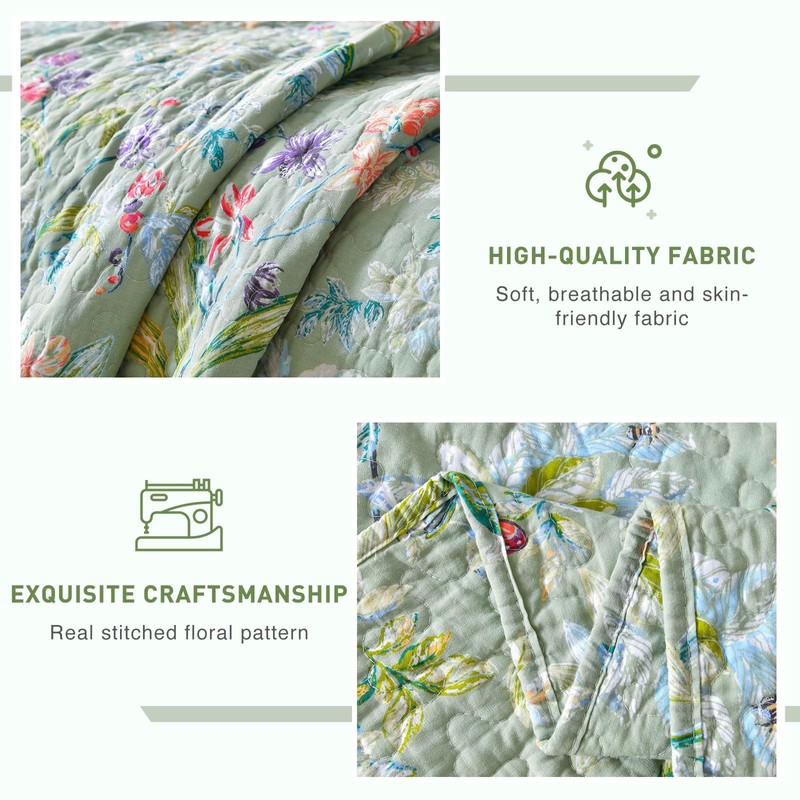 Lady Ann 100% Cotton Floral Oversized Queen Quilt Set - Green Flower Bird Butterfly Pattern Print Quilted 102x118 Bedspread & Coverlet Set, 3 PCS Lightweight Extra Soft Queen Bedding Sets All Season