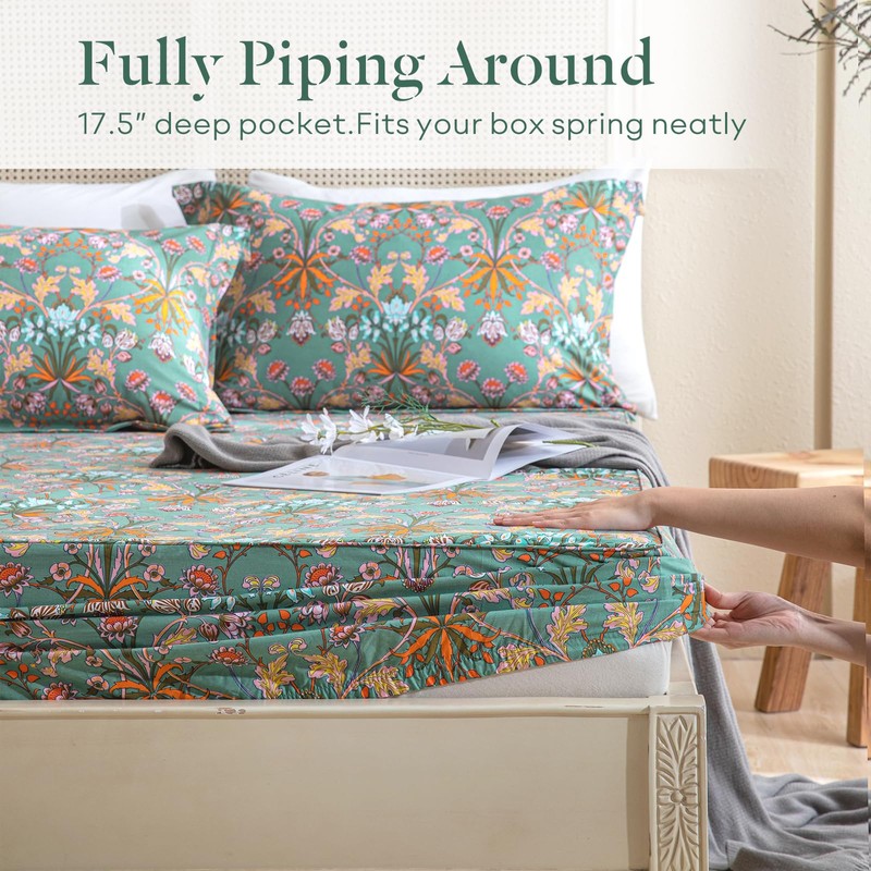 - 【Great Tailor Pattern & Printing】The unique paisley flowers printed on green pattern bohemian sheets bedding leaves a deep impression at the first sight. The cotton floral fitted sheet has deep pocket and elastic around the entire perimeter. Neat piping design on the fitted sheet makes the mattress more elegant! Easy go with western country, cottage farmhouse, bohemian, french country style home decor.