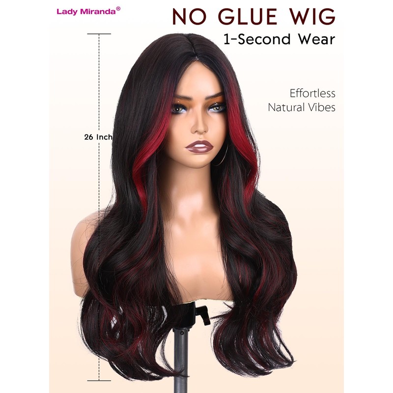 Lady Miranda 26 Inch Red and Black Long Wavy Wig Black Wig with Ombre Red Highlights Curtain Bang Wigs for Women Daily Part Use(Black and Red Color, 26 Inch)