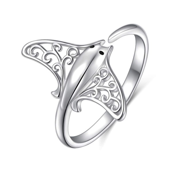 Ladytree S925 Sterling Silver Stingray Sea Animal Open Ring Manta Ray Tree of Life Adjustable Bypass Nature Ocean Ring,Size 6