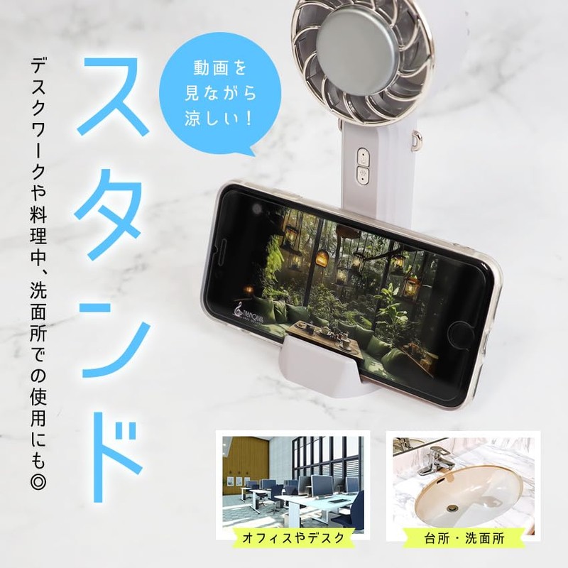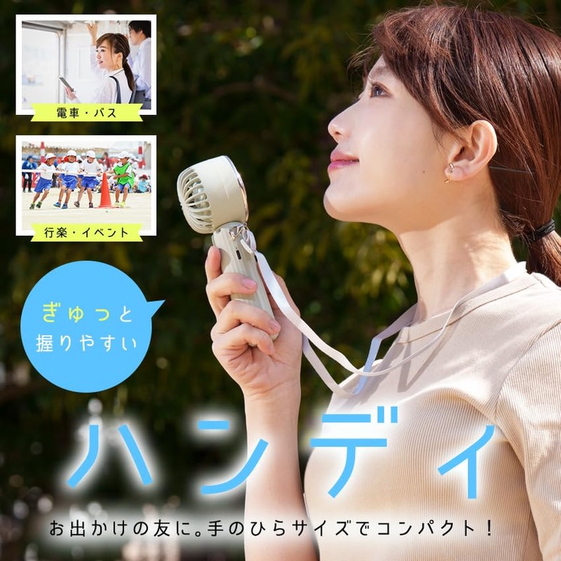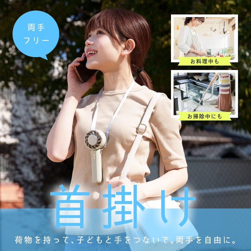 - (Convenient and portable functionality) This handy fan is easy to carry. Lightweight design around 170g Size is approx. 6.7 x 2.7 x 2.2 inches (170 x 68 x 56 mm). It can be easily stored in your bag or pants pocket. Comes with a custom adjustable neck strap. Made of soft and luxurious material that reduces the burden on your neck. Also, the fan part of the handy fan can be moved up to 90 degrees. The design allows you to reach itchy areas where you want the wind to be precisely blowing around your neck and face. It also comes with an attached stand for stability. It can be used as a desktop fan and also a smartphone stand. Enjoy watching videos and more. It is also important to operate, and the power can be turned on and off with a long press to prevent accidental operation when you put it in your bag