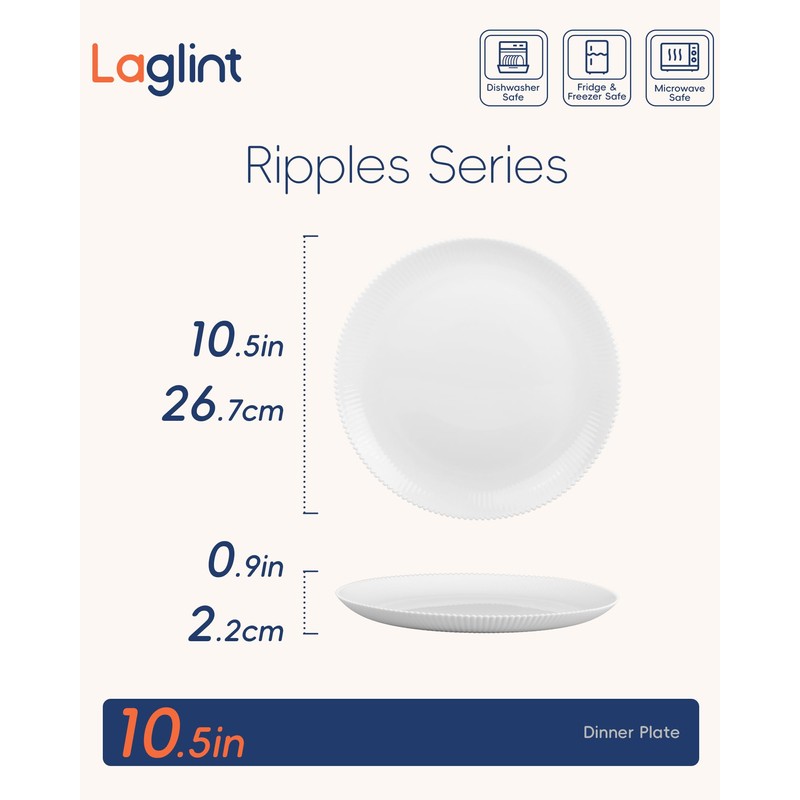 LaGlint 10.5 inch Ribbed Dinner Plate Set of 6, Round Opal Glass White Dinnerware Plates, Dishwasher and Microwave Safe
