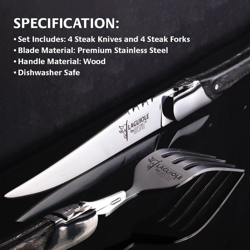Laguiole 8-Piece Steak Knife and Fork Set – Black Pakka Wood Handle, Premium ...