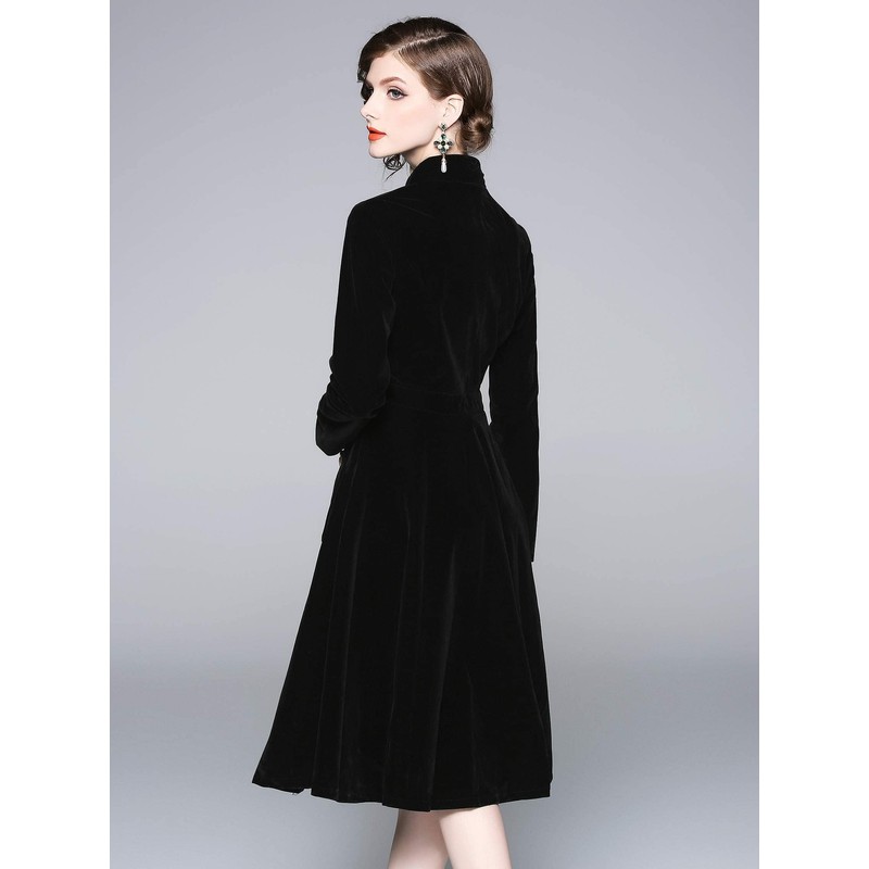 LAI MENG FIVE CATS Women's Long Sleeves Velvet Button Up Swing Midi Dress with Pockets Black