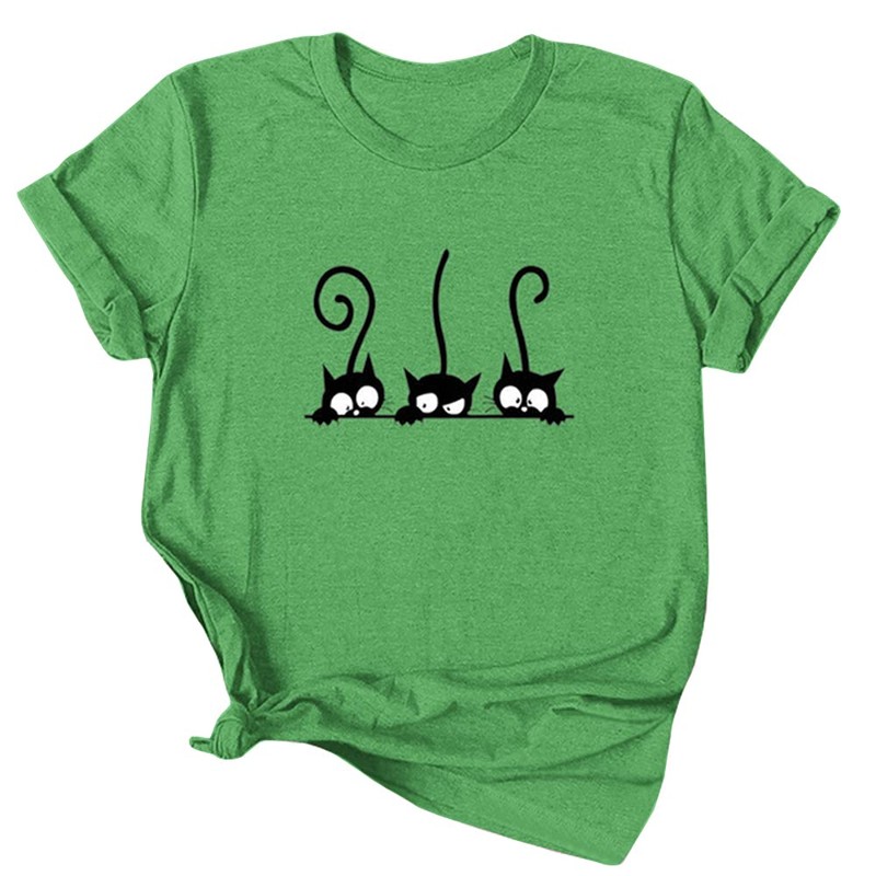 Lailezou Women's Three Cats Pattern Solid Color Printing O-Neck Simple T-Shirt Summer Casual Basic Short-Sleeved top Green