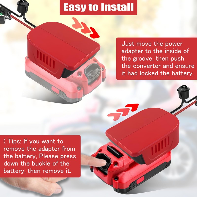 - 【DIY Function】This adapter is a cradle with positive and negative outputs,it has 14 gauge wire installed,Maximum permissible current 30A.you can DIY according to Real using requirements;DIY and upgrade your power wheels/kids car,toys or robotics,portable welder.Your old batteries no longer to be idle,and the uses of the adapter are endless.