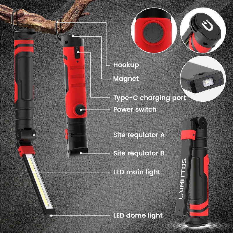 LAIMITTOS Rechargeable Work Light 2500mAh Magnetic LED Work Light Foldable Flashlight with Hook 3 Lighting Modes Mechanic Light Portable Outdoor Lamp for Car Repair, Home, Garage, Emergency
