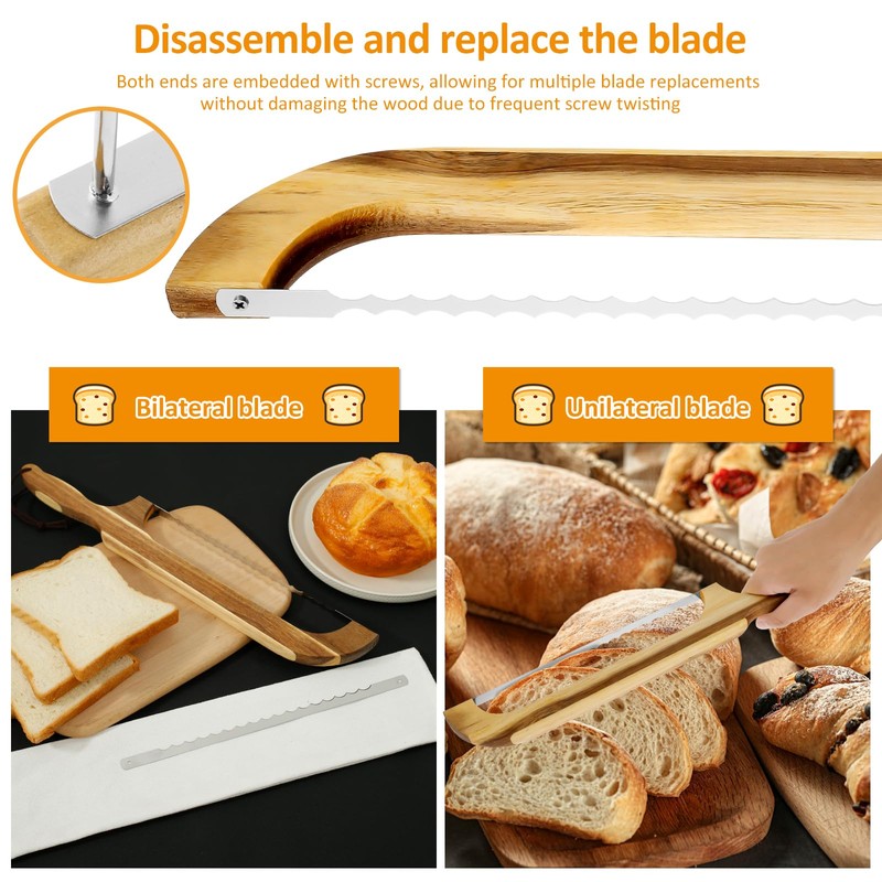 Package Includes: The package includes 1 bow bread knife, 2 double sided blades, 1 single sided blade, 2 knife guards, 1 screwdriver and 1 storage bag. 3 blades for your replacement needs. Screwdriver for easy removal and installation. Storage bag and knife guard for easy and safe storage.
