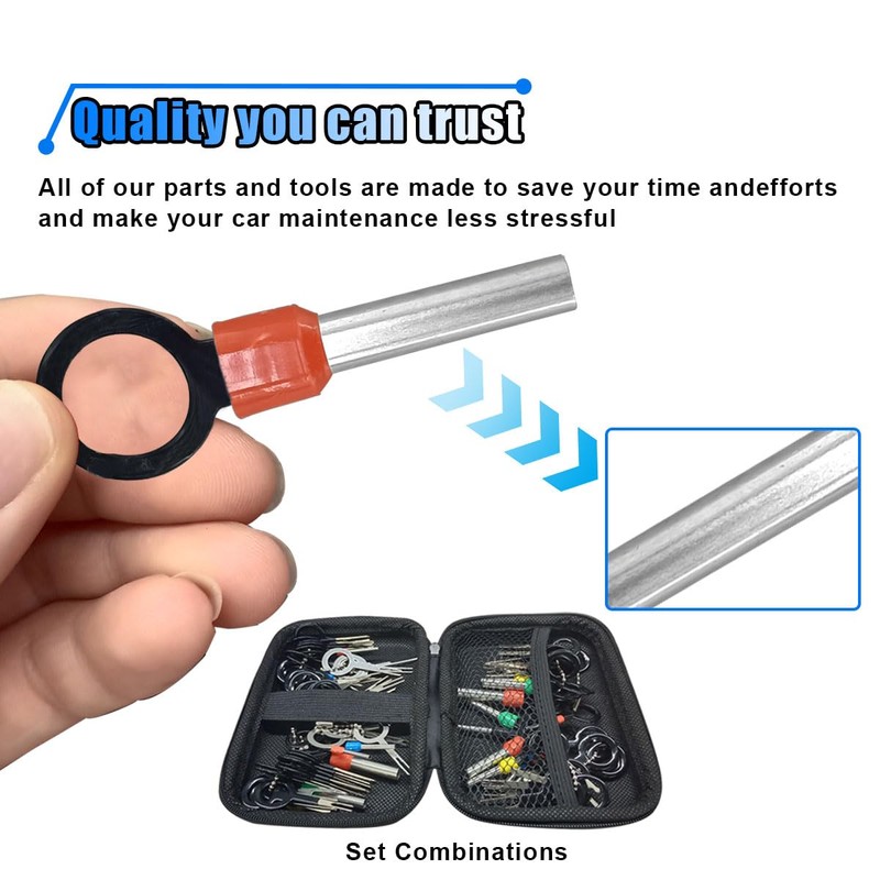 - 【Easy to Use】: The car terminal pin removal tool is easy to use, it has no complicated operation, just use the connector removal tool to push and pull the terminal pin to remove the pin easily. Note that most of the wiring harnesses have barbed clips, you can use the tool to flatten to make the removal process smoother, but you need to control the strength and direction to avoid unnecessary damage.