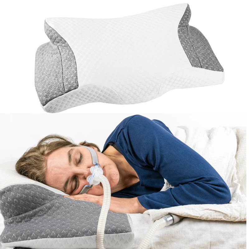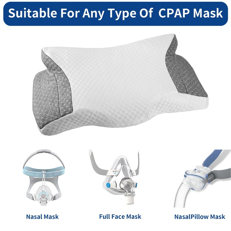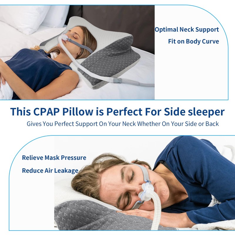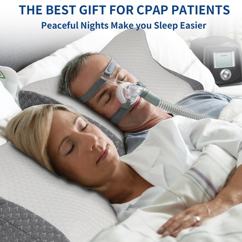 - INNOVATIVE DESIGN : The unique shape of this memory foam pillow is designed to accommodate CPAP masks and hoses. The cut-outs on each side allow you to rest the side of your head in the middle with the mask in the cutout, which help to keep CPAP tubing organized. This design also helps to alleviate mask pressure on the face while reducing the frequency of air leaks which bring you better sleep quality.