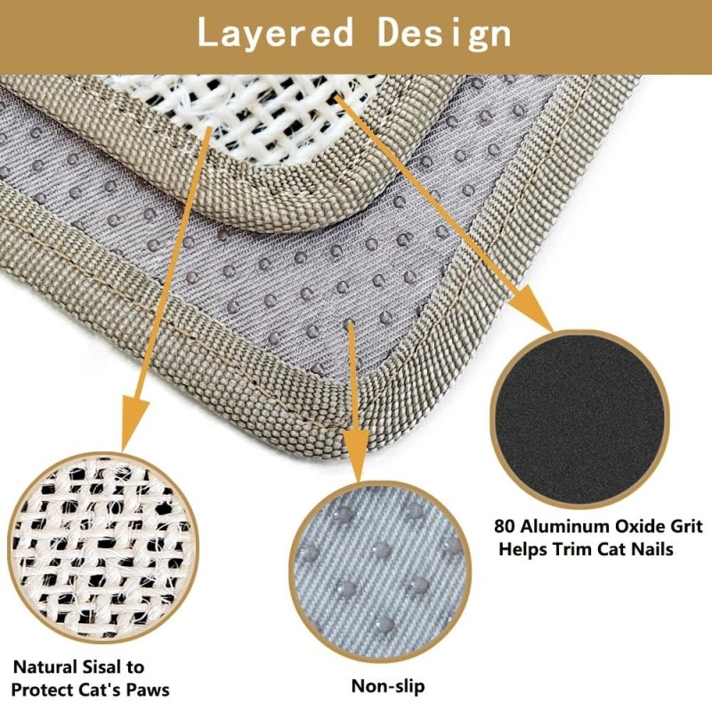 LAYER DESIGN:The outer layer of this netted cat scratching mat is made of natural sisal plant leaves, a material most cats love to scratch, which protects the paws against the sandpaper below, the inner layer has 80-gauge aluminum oxide grit, which is effective in helping cats trim their nails, and the back of the cat nail file scratcher has small, non-slip particles that prevent the mat from sliding up and down.