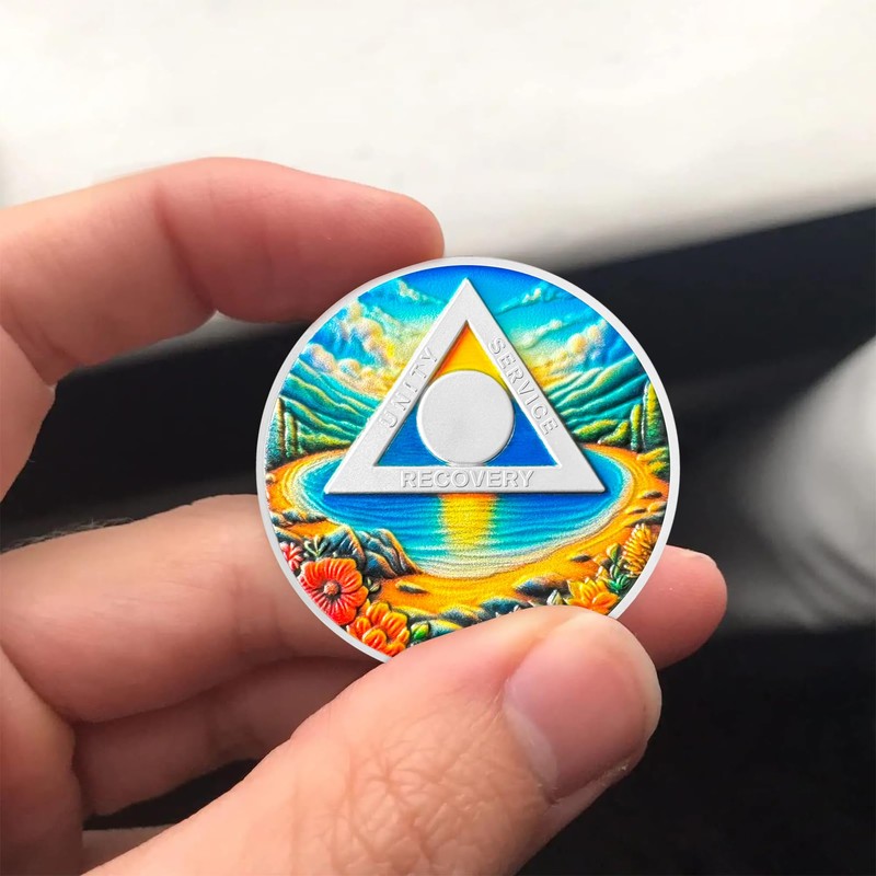 This Lake and Triangle Recovery Medallion is a beautiful symbol of the recovery journey, featuring a serene lake scene with a central triangle representing Unity, Service, and Recovery. The reverse side displays the Serenity Prayer, a powerful reminder of acceptance, courage, and wisdom. With its vivid design and meaningful message, this medallion serves as an inspiring token of hope and strength, perfect for anyone committed to personal growth and sobriety.