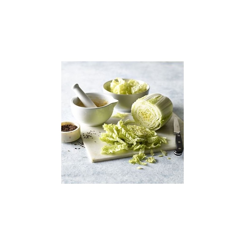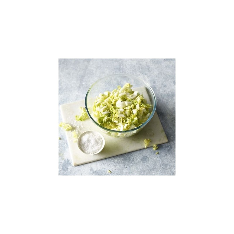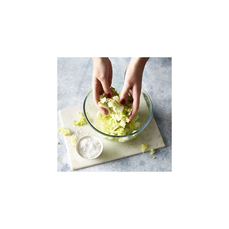 To make a basic sauerkraut that’s a world away from the stuff you find in supermarkets, all you need is cabbage and salt. Simply shred the cabbage and massage the salt into it until the cabbage goes soft and starts to produce a natural brining liquid. About five to ten minutes should do it and it’s really quite therapeutic. Add some caraway seeds for extra flavour, if you like, then put everything in this wide-mouthed fermentation and preserving jar, top up with water until the cabbage is covered, weigh it down with a cling-film-covered ramekin filled with baking beans and put the lid on. That’s it.