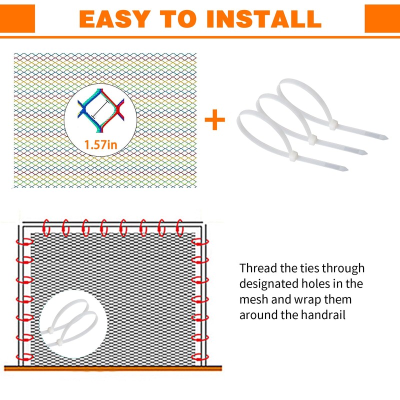 - Uniform Mesh and Knotless Weaving : The mesh size of our stair safety net is uniform, which can evenly distribute force and make the tensile strength more strong; The rope net adopts knotless double needle weaving,making the surface of the protection net more flat and looks more beautiful.