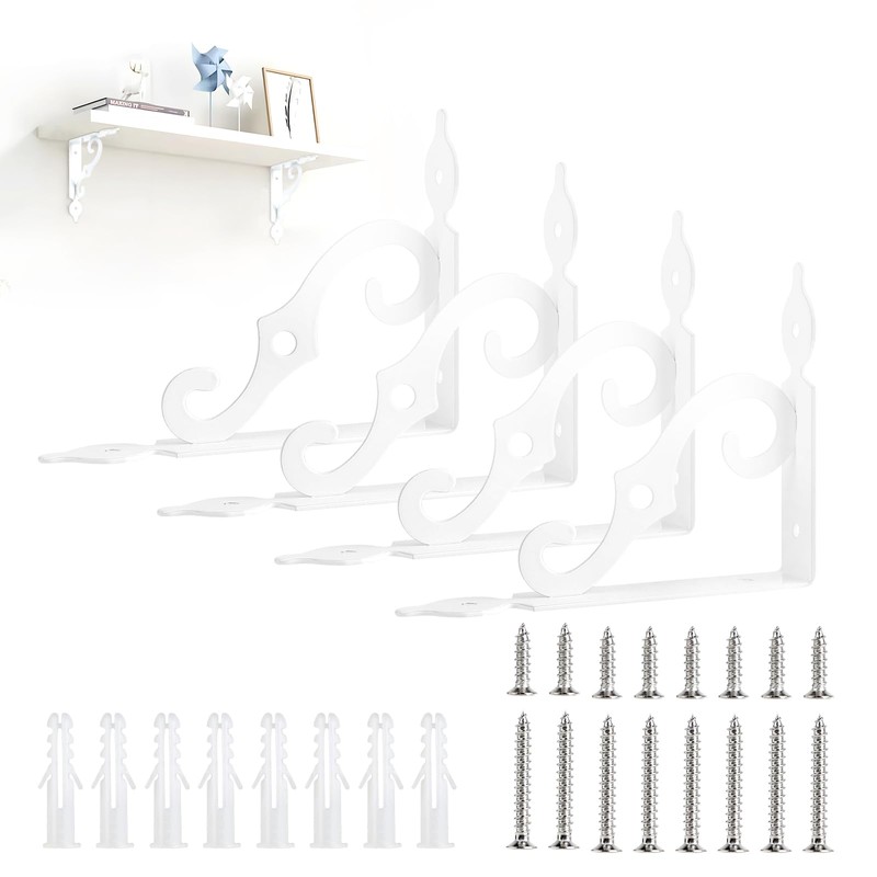 LALAGO Pack of 4 White Metal Shelf Brackets, 14 cm, Shelf Brackets, Vintage, Antique Style, S-Shaped Shelf Brackets, Heavy Duty Angle for Wall Shelf, Floating Shelf, Wall Console, Shelves
