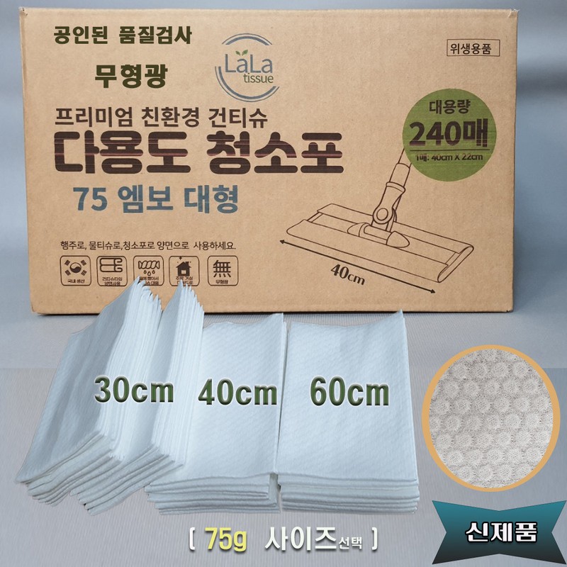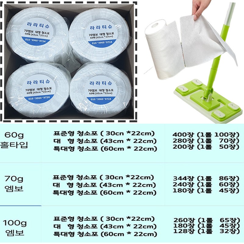 Lalatish cleaning cloth extra large/wet mop/dishcloth/hole type 60g 60cm/22cm 100 sheets, embossed 100g 43cm/22cm 90 sheets / 라라티슈 청소포 특대형/물걸레/행주/홀타입60g 60cm/22cm 100장, 엠보100g 43cm/22cm 90장