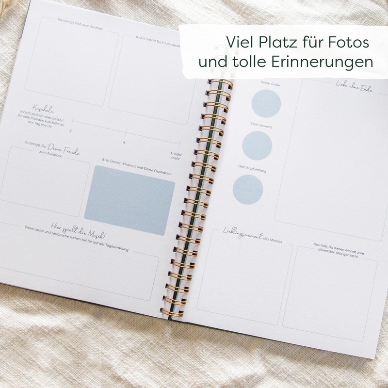 - Contents: Here you can capture memories and photos of your baby from birth to the first adventures to the first birthday