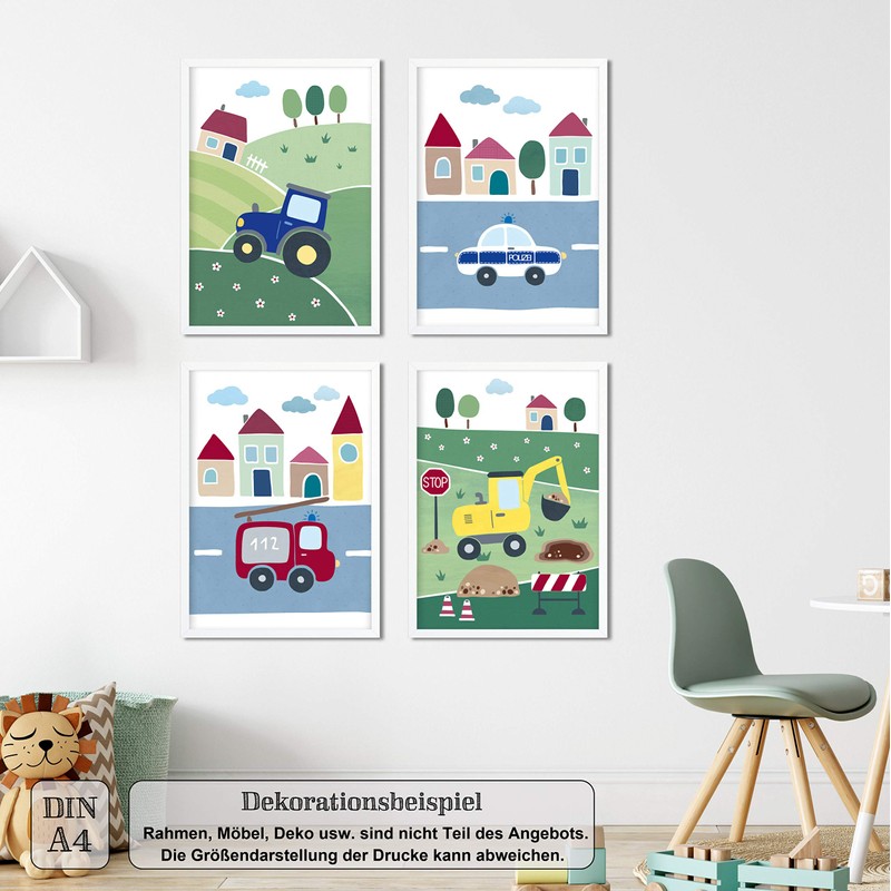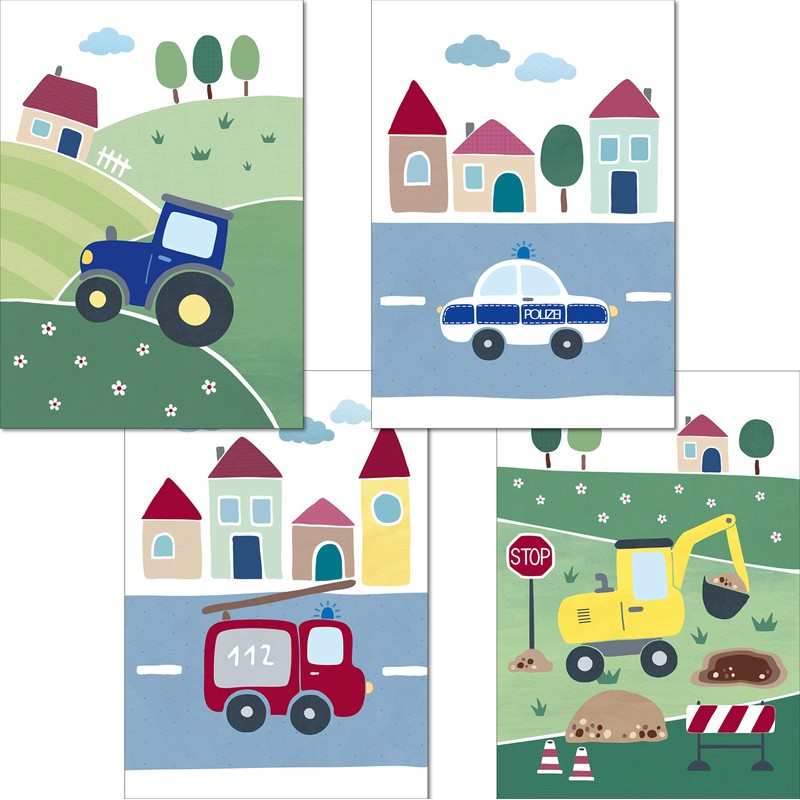 LALELU-Prints Set of 4 Children's Room Pictures, Cute Vehicles, Just the Right for Little Boys, Perfect for Baby Room (DIN A4 without Frame)