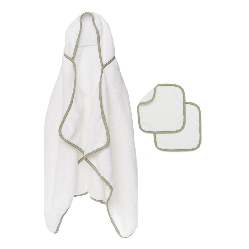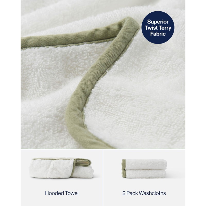 Lalo The Hooded Towel & Washcloth Set, 100% Organic Cotton, Soft on Sensitive Skin, Durable & Absorbent, Machine Washable, includes One Baby Towel and Two Washcloths - Sage