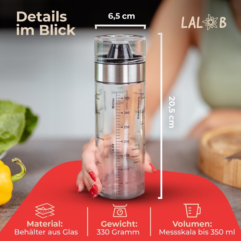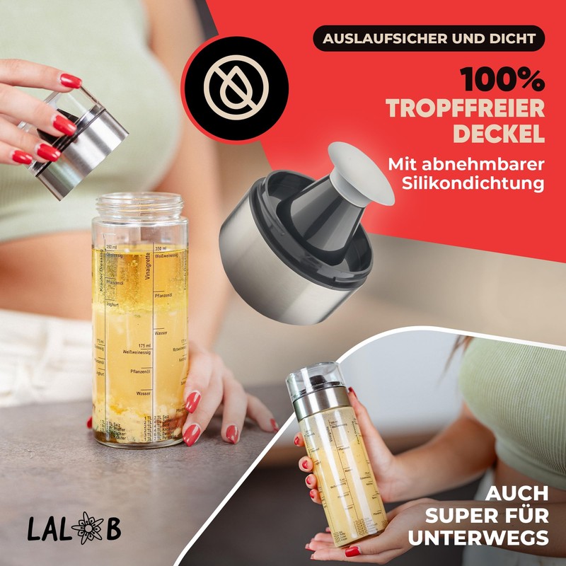 LALOB® Dressing Shaker - Dishwasher Safe - Five Recipes in 175ml and 350ml - Leak-proof Container - Salad Sauce Shaker Cup